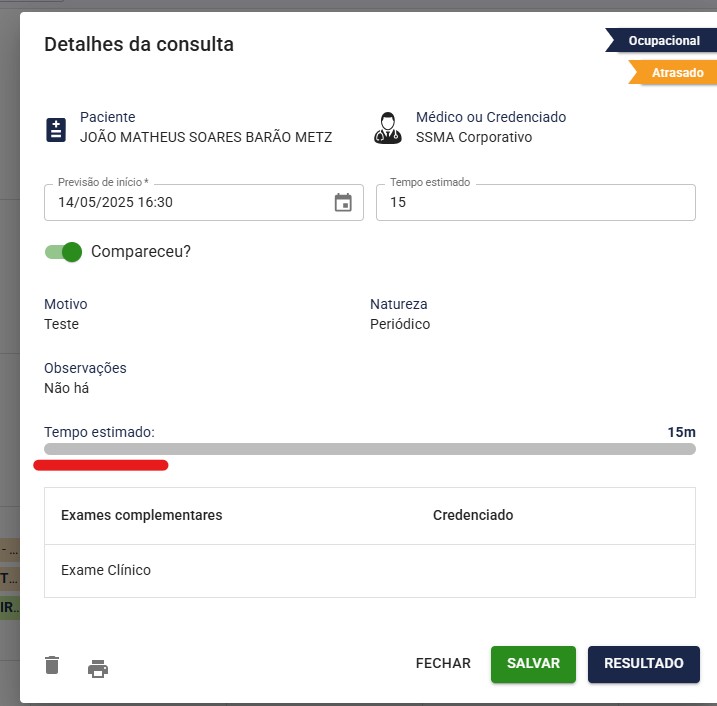 Temos a necessidade de que o tempo contabilizado de atendimento do colaborador seja considerando desde o momento da triagem até a emissão final do ASO e encerramento da consulta, visto que a intenção é identificar o tempo em que o colaborador permaneceu na área da saúde.