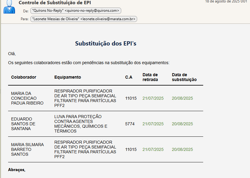 Os e-mails que recebemos referente aos vencimentos dos EPIS deveriam ser mais completos (CNPJ, empresa, função, etc.). No meu caso, sou responsável por diversas empresas, e nos e-mails que estou recendo não tem nenhuma informação que eu consiga identificar de qual empresa o colaborador é registrado.