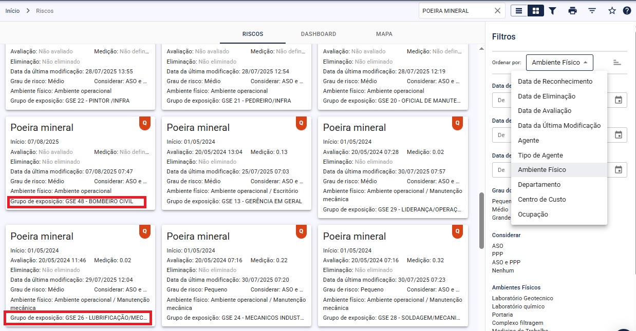 Seria possível melhorar o filtro para o cadastro de risco, acrescentando a opção de filtragem pelo GRUPO HOMOGENEO? Desta forma, o sistema iria colocar em ordem do nome do risco e do grupo homogêneo de risco, uma forma mais amigável para o cliente.
