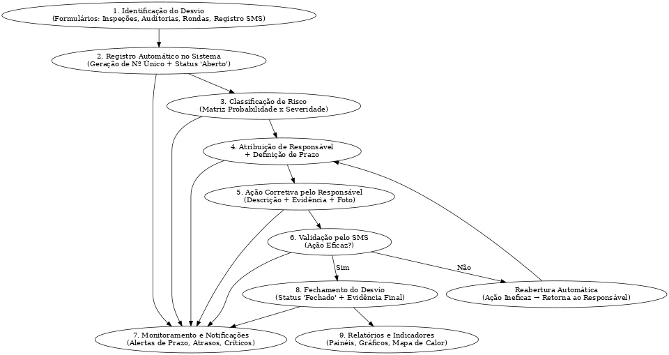 Para fortalecer a cultura de segurança e melhorar o controle de riscos na obra, estamos propondo a implementação de um módulo de Gestão de Desvios dentro do sistema corporativo de SMS. Atualmente, os desvios são identificados em diferentes frentes — inspeções de segurança, auditorias comportamentais, rondas de segurança e gerenciais, além dos formulários de registro SMS. No entanto, essas informações ficam dispersas e sem um fluxo padronizado de acompanhamento. Com a nova seção, todos os desvios identificados em campo serão automaticamente centralizados em uma base única, com número de registro, classificação de risco, atribuição de responsável, prazo de correção e validação final pela equipe de SMS.