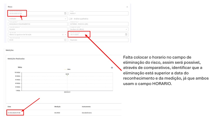Hoje o sistema já faz uma comparação entre a data do reconhecimento do risco com a data da medição, através através da data e da hora que forem cadastrados. Mas não realiza o mesmo procedimento quando se trata da data de eliminação do risco.