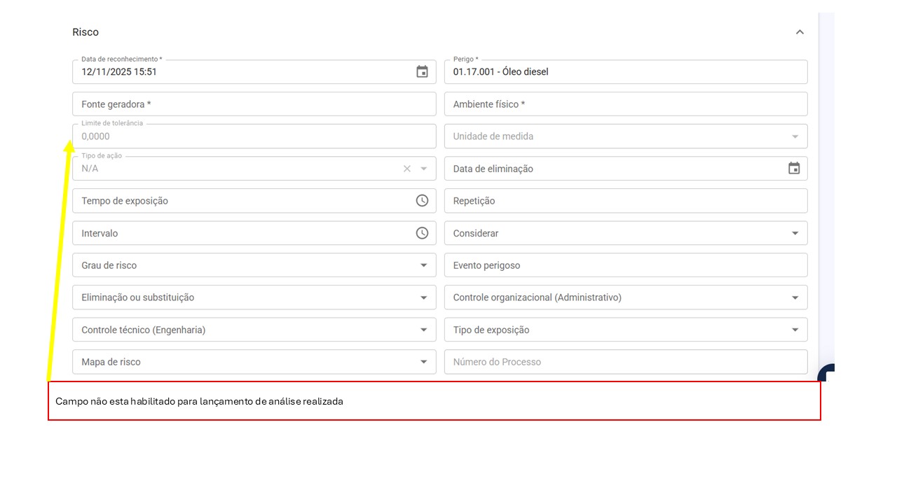 No caso do agente ambiental "Óleo diesel", por exemplo, ele se enquadra no tipo S- 2240 (agente nocivo), com necessidade de avaliação qualitativa do risco (NR 15, anexo 13). No entanto, foi realizada também a medição (avaliação quantitativa) seguindo diretrizes internacionais (ACGIH), conforme registrado no LTCAT. No Quírons, essa informação não será aproveitada, pois, como o risco é de avaliação qualitativa, o campo de adição de medição fica desabilitado;