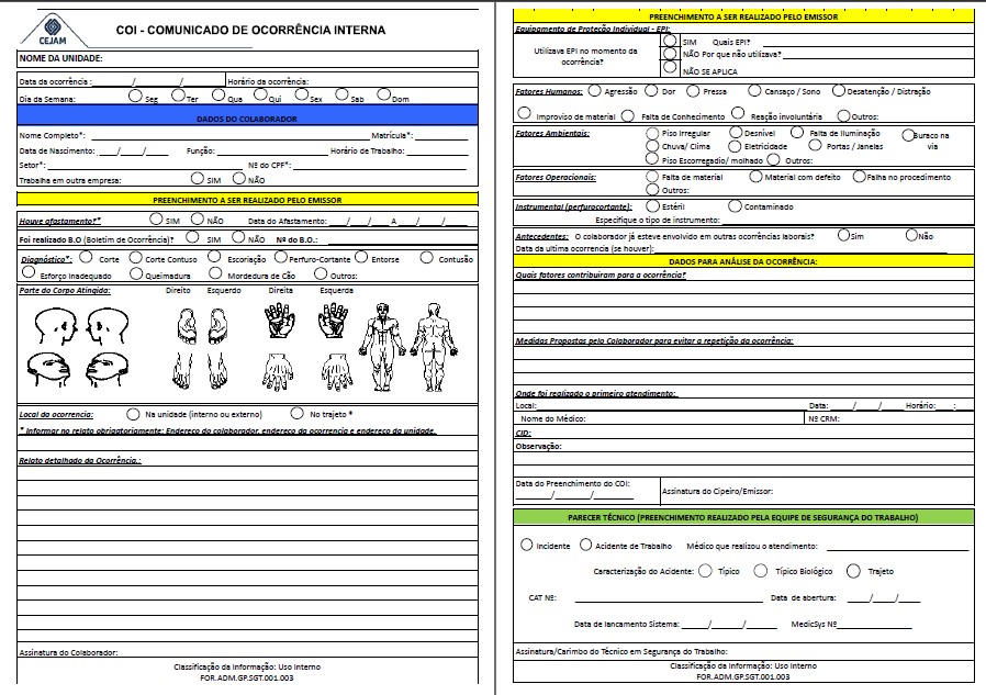 Atualmente, a solicitação é realizada por meio do formulário denominado COI – Comunicado de Ocorrência Interna/Externa, mas em outras instituições, utiliza-se a nomenclatura RIAT, CIAT ou Comunicado de Acidente de Trabalho. Vale ressaltar que, embora esses termos sejam técnicos, a nomenclatura adotada deve ser revisada, pois o pré-cadastro tem o objetivo exclusivo de comunicação. Usar a expressão "Ocorrência" no nome evita que se associe diretamente ao conceito de acidente de trabalho, o que poderia gerar confusão, especialmente se a ocorrência for posteriormente descaracterizada como um incidente.