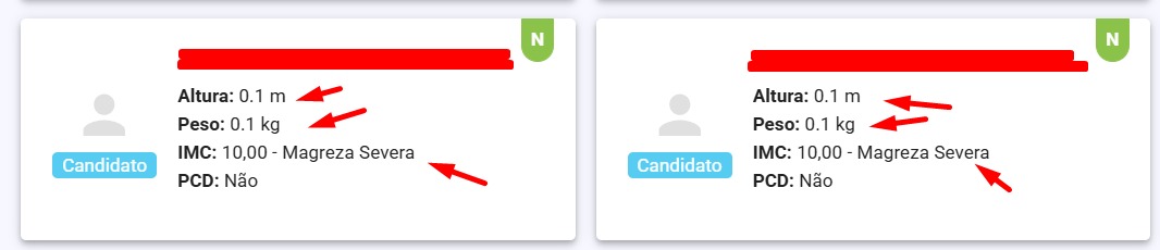 Ao registrar um novo prontuário, o sistema gera automaticamente o cálculo com altura “0,1” e peso “0,1”, o que resulta na classificação “Magreza Severa”. Como esses valores não correspondem aos dados reais do colaborador, o desejável é que o resultado exibido seja algo como “N/A”, indicando que ainda não foram informados os dados de peso e altura.