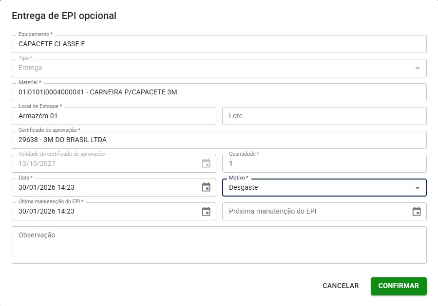 Seria interessante ao realizar a entrega de EPI, após serem preenchidos os dados referentes a Equipamento, Material, Local de Estoque, Certificado de Aprovação, apresentar em algum campo o saldo em estoque daquele Material, uma vez que a única forma de consulta é pelo menu "Outros > Materiais" onde a consulta dos saldos é realizada de forma individual, clicando no material escolhido. Isso facilitaria muito o acompanhamento dos saldos pelo responsável em realiza a entrega.